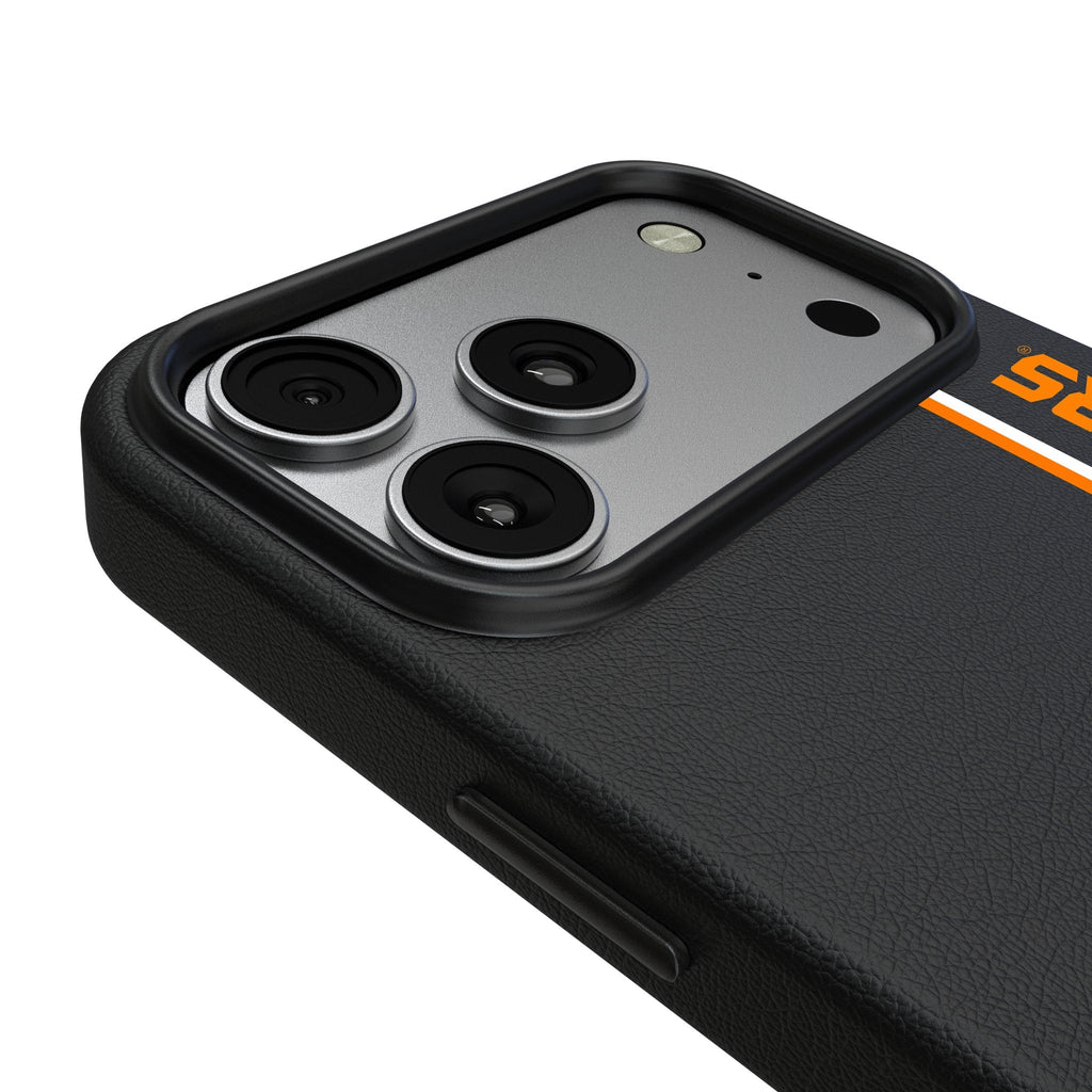 This premium black leatherette case sports an officially-licensed design and is MagSafe compatible. Designed and decorated by Keyscaper in Tualatin, Oregon, USA., this stylish cell phone case is a great way to show off your true fandom. Striking a great balance between bulk and protection, it is durable, has precise speaker and port cutouts, and is compatible with wireless charging devices.