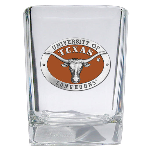 This 1.5 ounce square shot glass is highlighted with a fine pewter casting. Made in USA.