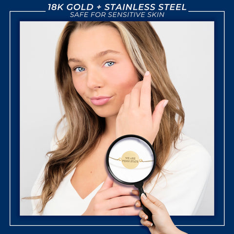 Elevate your style with our Penn State University Nittany Lions bracelet, exquisitely crafted with 18K gold plated stainless steel and meticulously designed to offer Penn State Nittany Lions elegance and durability. This stunning Penn State bracelet is the perfect accessory for any occasion, blending timeless style with modern sophistication. Our Nittany Lions Jewelry offers an adjustable design, ensuring a perfect fit for everyone and allowing you to choose a snug or loose fit according to your preference. This Penn State bracelet is also great for stacking and layering! Made from high-quality 18K gold plated stainless steel, this bracelet is safe for sensitive skin, offering visual luxury without any irritation. Each Nittany Lions bracelet is designed to maintain its shine with long-lasting beauty and durability. The sleek and elegant design makes it a versatile piece that complements any outfit and especially Penn State Nittany Lions Apparel, from casual to formal wear to Penn State Nittany Lions Football Gamedays, showcase your Penn State Nittany Lions pride. Featuring a secure pull chain closure, you can wear your bracelet with confidence, knowing it will stay in place all day long. This adjustable bolo chain bracelet captures the spirit and tradition of The Penn State University with the iconic engraved 'We Are Penn State' charm design. Ready to gift, our Penn State jewelry comes in beautiful, elegant packaging and a bow, making perfect Nittany Lions Gifts for women, Penn State Birthday Gifts, Graduation Gifts, Penn State Alumni Gifts, back-to-school, or anyone that is a Penn State University fan. Enjoy the ease of maintaining your bracelet with simple cleaning, ensuring it remains radiant and beautiful for years to come. With its classic design, this Penn State bracelet transcends trends, offering a timeless piece that you'll cherish forever. We Are Penn State!